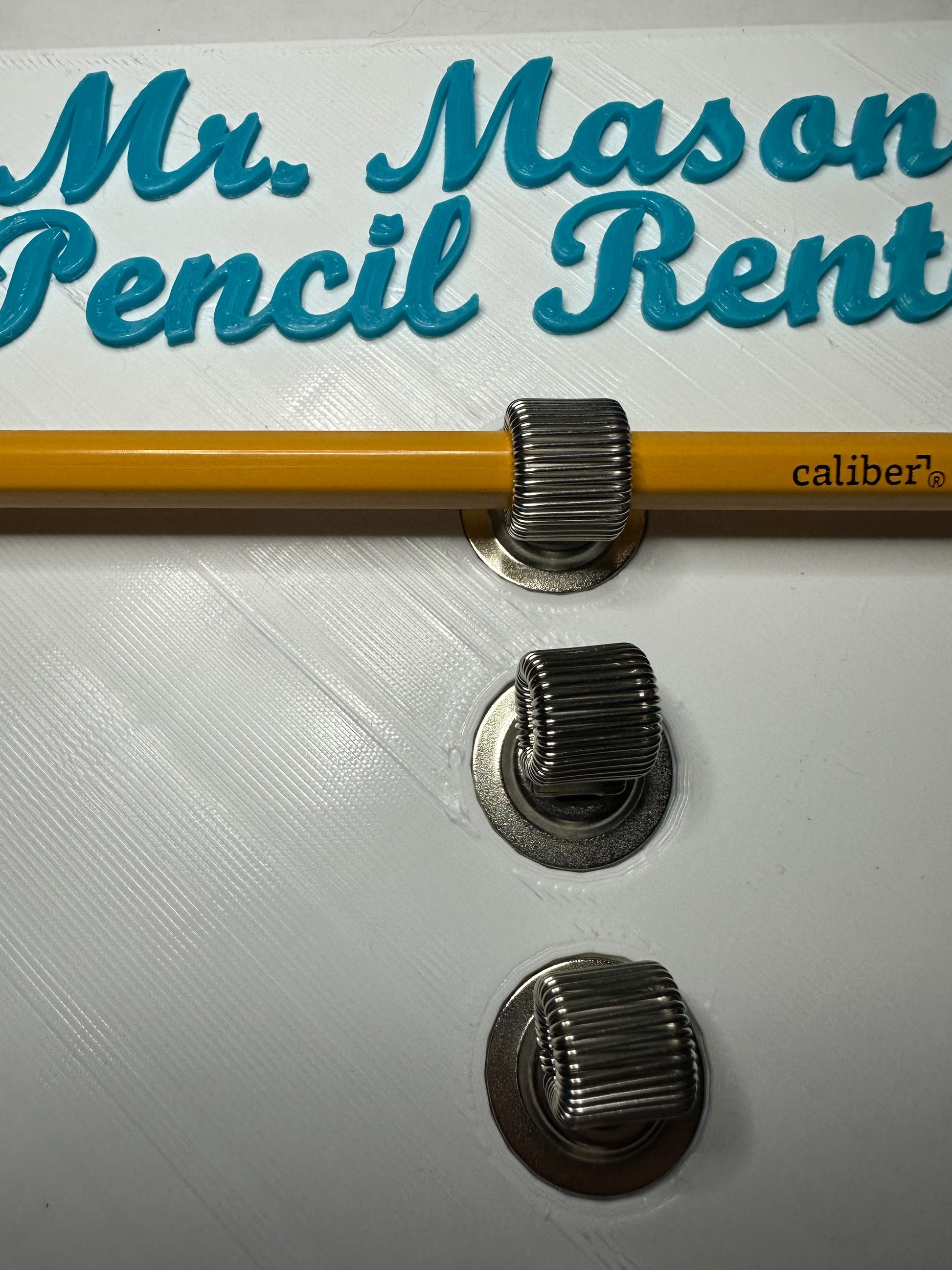 The base and text are 3D printed, and the pencils are held in spring like metal holders, so they'll hold writing supplies of nearly any size! Each holder can hold up to 10 pencils, is magnetic, and comes with a removable chain if you'd rather hang it on a hook.